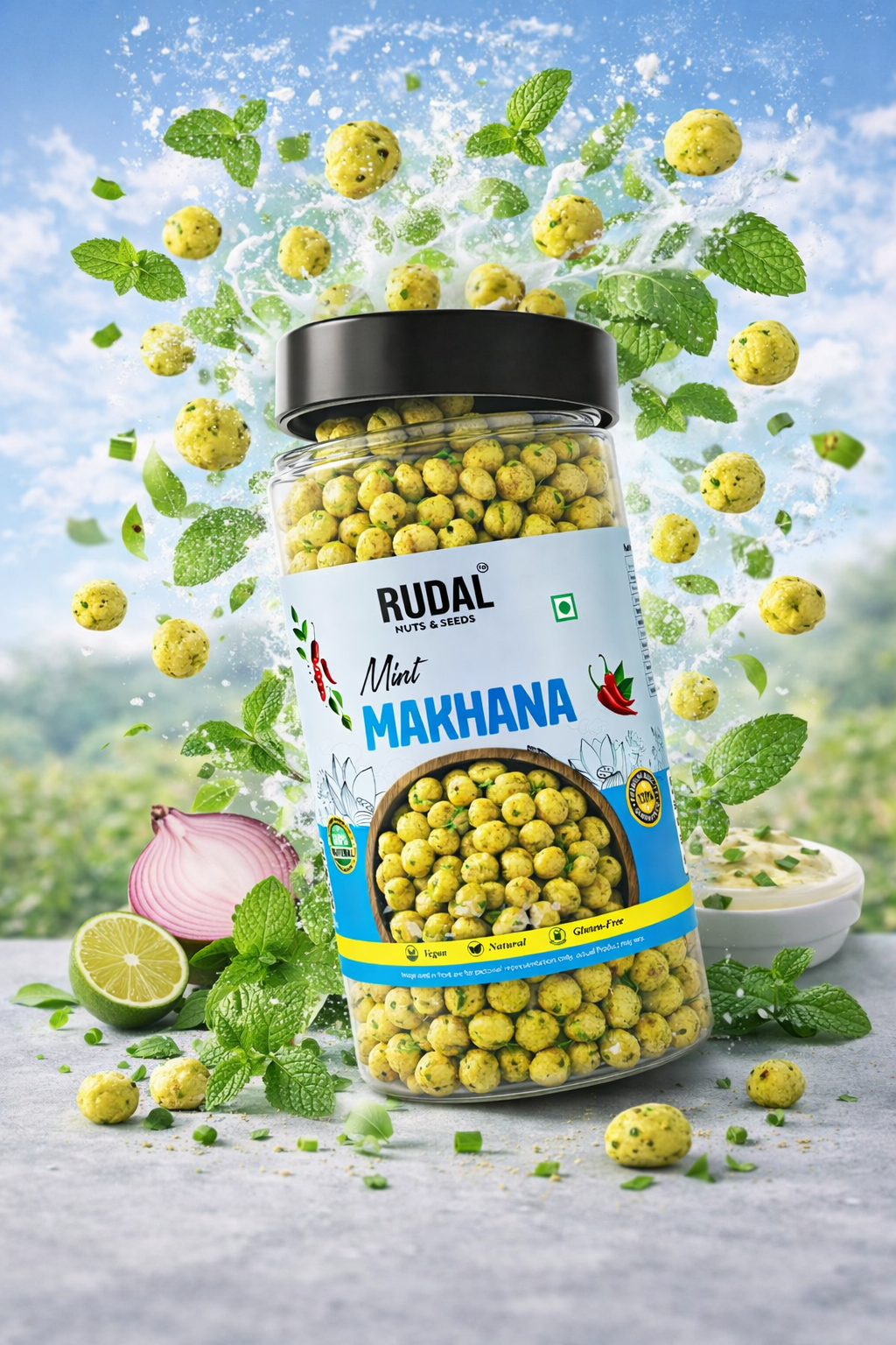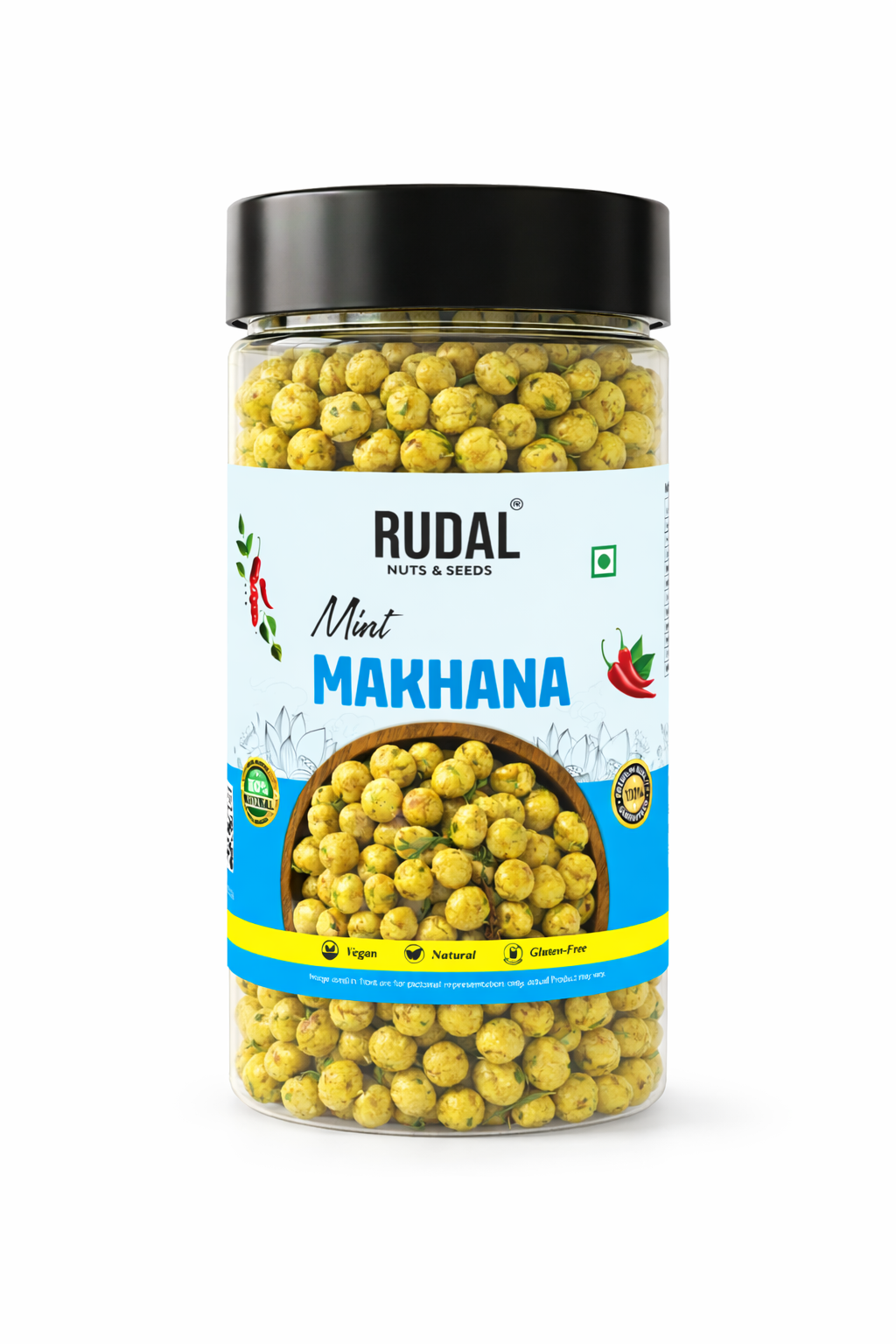 Roasted Makhana, Rice Bran Oil, Spices & Condiments (Red chilli, Coriander Seeds, Dried mango. Cumin Turmeric, Dried Ginger, Long Pepper, Fenugreek, Mace Nutmeg), Edible salt, Black Salt, Sugar,Mint Leaves (7%), Fenugreek Leaves, Peanut, , Acidity Regulator (INS-330) & (INS-296), Natural Identical Flavoring Substances (Mint), Flavour Enhancer (INS 627) & (INS 631), Anticaking Agent (INS 551). Contains added Natural and Nature Identical Flavouring Substances.