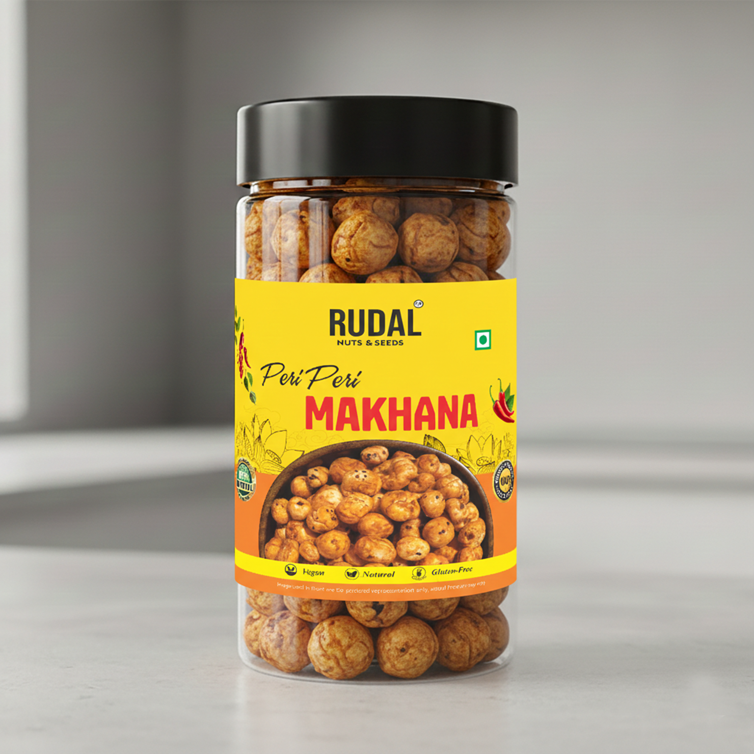 RUDAL Peri Peri Makhana ek tasty aur healthy snack hai jo freshly roasted fox nuts se bana hai. Isme peri peri spices ka perfect blend hai jo har bite ko spicy aur crunchy banata hai.